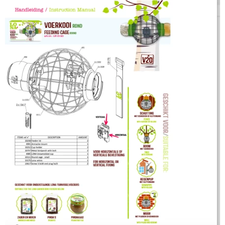 LONA V20 est une cage d’alimentation ronde qui protège les petits oiseaux de jardin contre les prédateurs naturels tels que les chats et les grands oiseaux, leur permettant de se nourrir en toute tranquillité. Nourrissez les oiseaux avec plusieurs aliments à la fois avec les 2 unités d’alimentation. Le V20 peut également être utilisé avec du beurre d’arachide LONA. Une vue fantastique! Et les oiseaux adorent le beurre d’arachide LONA.